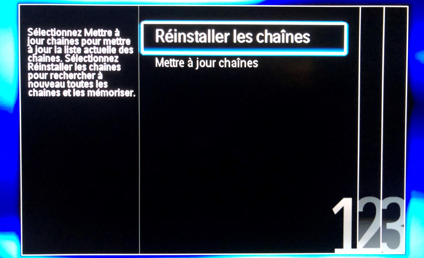 Choisissez Réinstaller les chaînes puis appuyez sur OK.