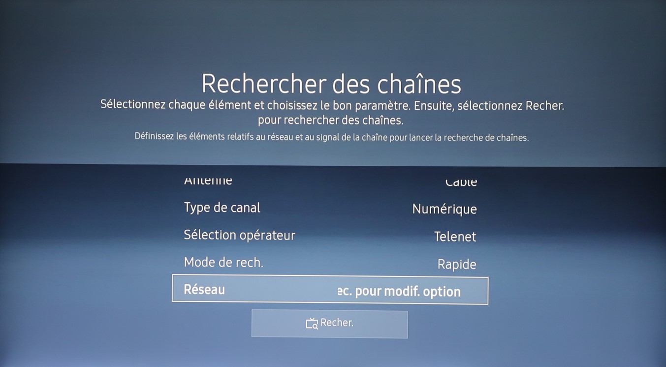 Choisissez Réseau et appuyez sur OK pour modifier les options de recherche.