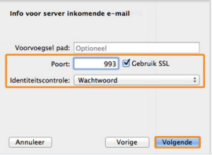 Vul onderstaande gegevens in onder Info voor server inkomende e-mail: