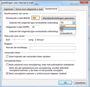 Inkomende e-mail (IMAP): wijzig het poortnummer (IMAP) naar 993 en wijzig het type versleuteling van Geen naar SSL.