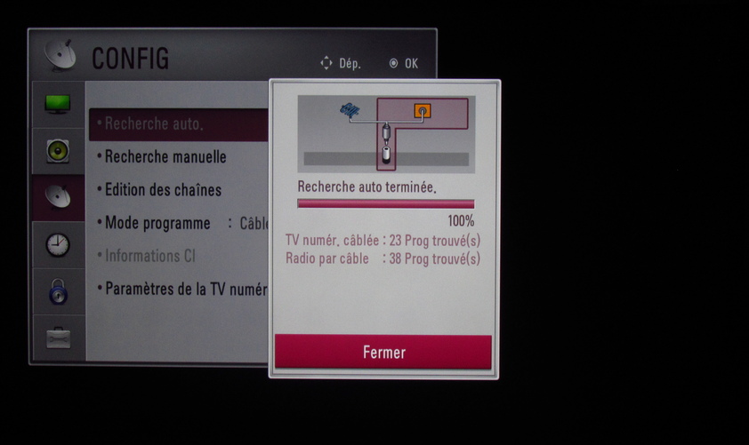 Veuillez patienter, votre téléviseur est à la recherche de chaînes. Dès que le téléviseur est prêt, il affiche les chaînes trouvées. Choisissez ensuite Fermer et appuyez sur OK