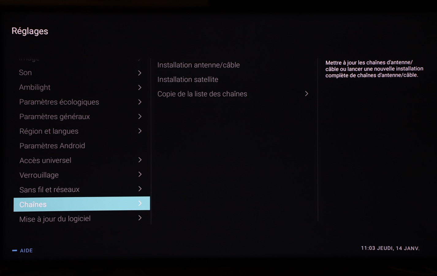 Accédez à Chaînes à l'aide des touches fléchées et appuyez sur OK.