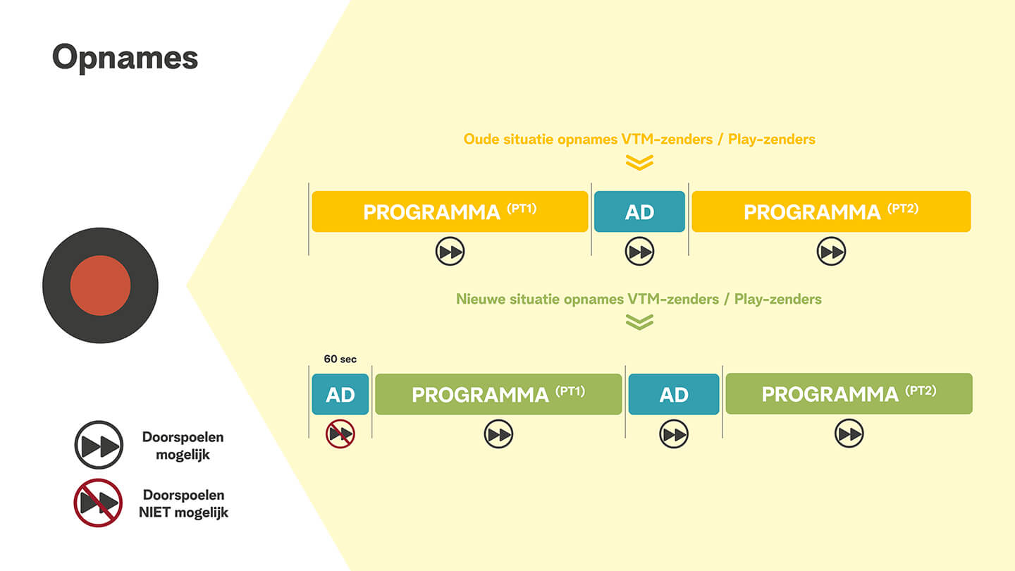 Eerst even dit: onderstaande veranderingen aan je kijkervaring zijn alleen van toepassing op de zenders van VTM en GoPlay. Op alle andere zenders wijzigt er niets aan je huidige opname- en Terugkijk TV-functies.
