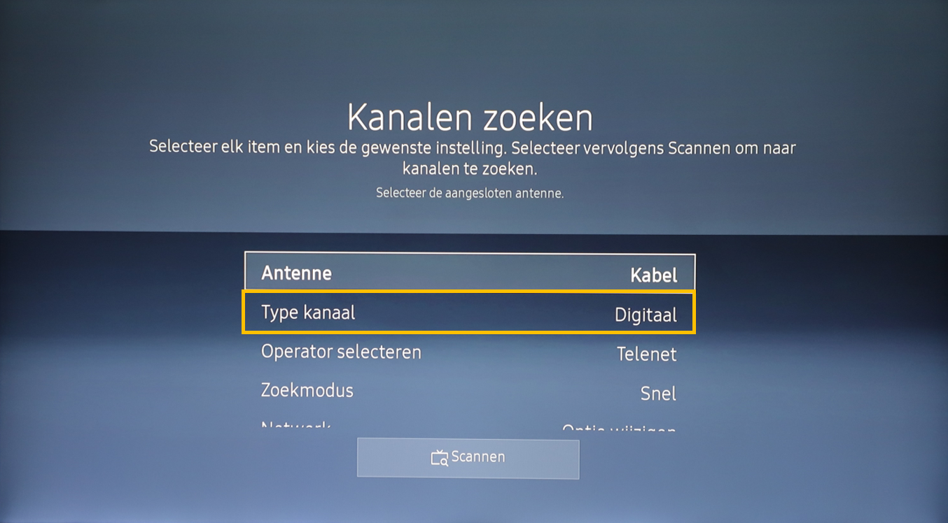 Check eerst even of Kabel geselecteerd staat bij Antenne.