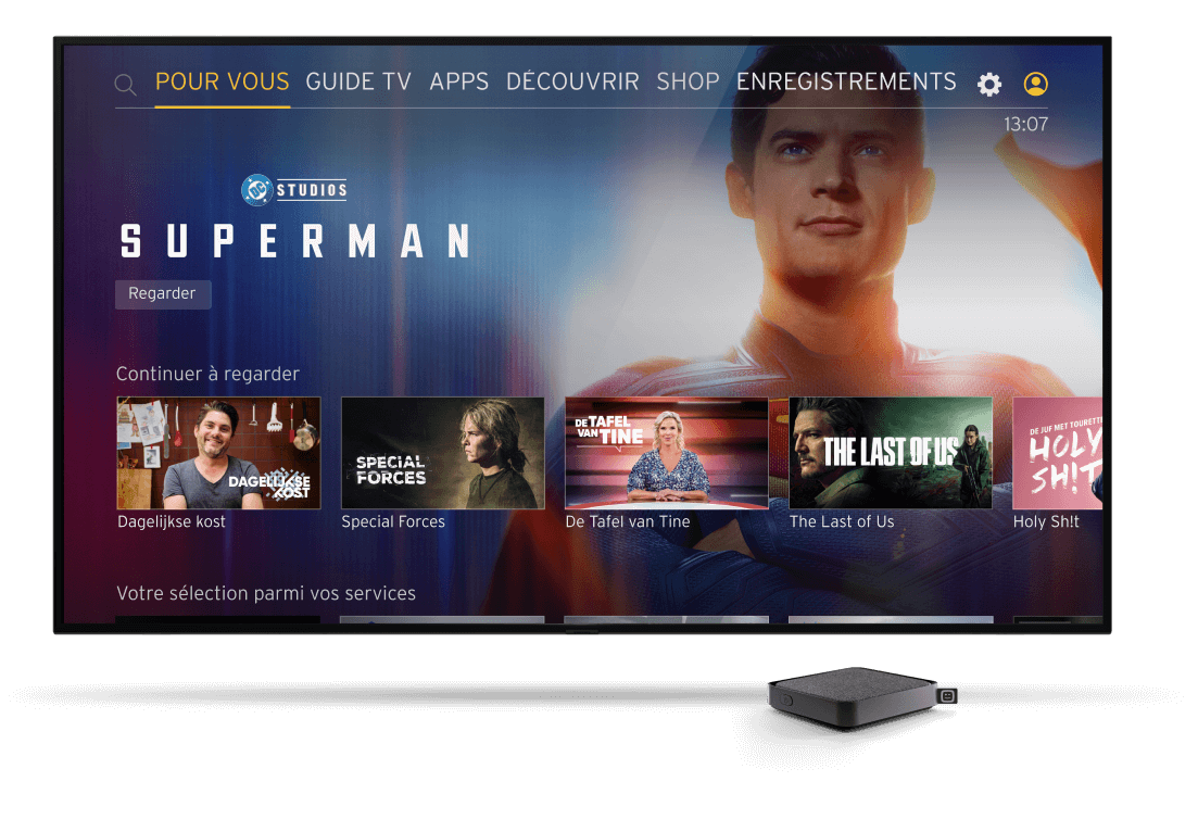 Vous cherchez l'inspiration ? Avec tous vos divertissements regroupés au même endroit, votre nouvelle page Découvrir est plus pratique qu'une smart TV Tous les programmes et séries flamands « De chez nous » (VRT, VTM, Play, Streamz, etc.) y figurent aux côtés des succès internationaux les plus regardés. Regardez des émissions en direct, profitez de Replay TV et trouvez facilement les séries et les blockbusters dont tout le monde parle.
